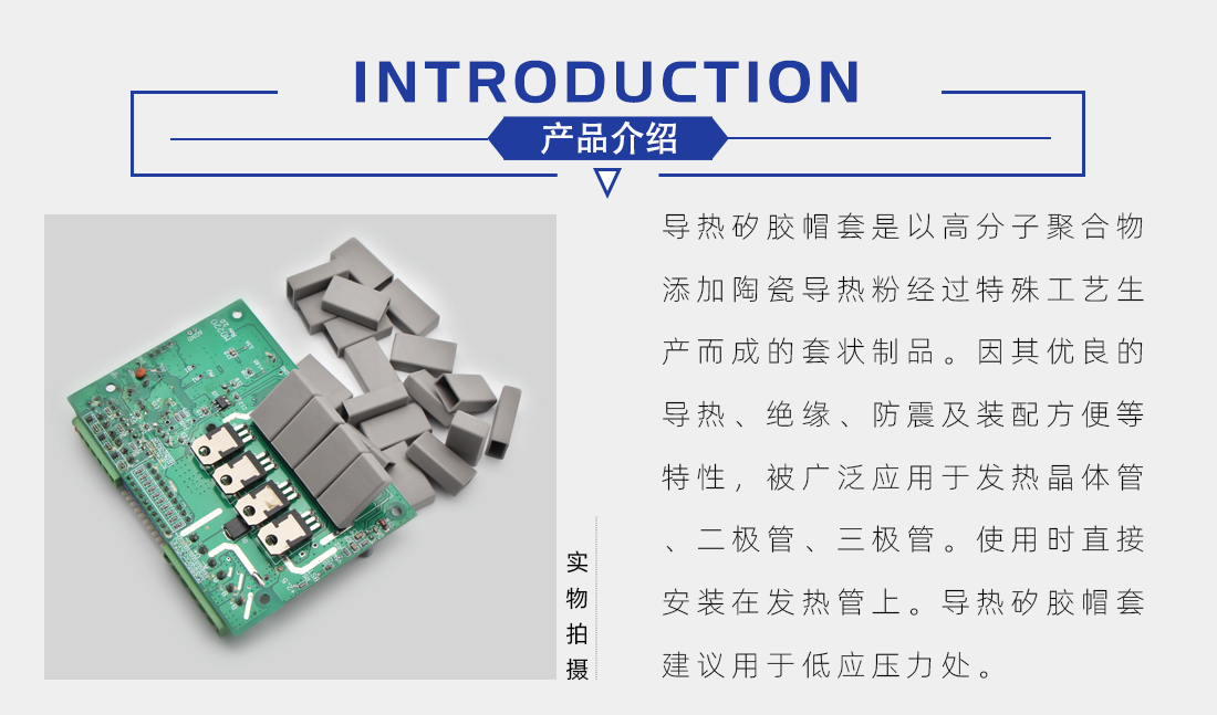 簡介:導熱矽膠帽套是以高分子聚合物添加陶瓷導熱粉經過特殊工藝生產而成的套狀制品。因其優良的導熱、絕緣、防震及裝配方便等特性,被廣泛應用于發熱晶體管、二極管、三極管。使用時直接安裝在發熱管上。導熱矽膠帽套建議用于低應壓力處。