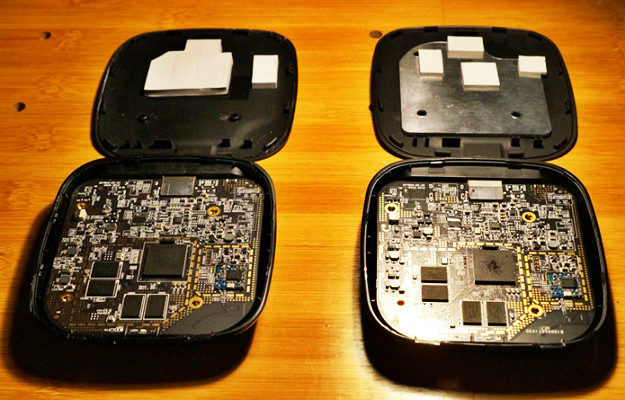 小米盒子的外形簡單大方,外殼是通過一些塑料卡扣來固定閉合, 。拆開之后可以的看到盒子內部電子部件及散熱方案,可以清楚的看到外殼上分布著一些導熱硅膠片,以此來傳遞內部熱量到外殼進行散熱,一般而言,家用電器在正常工作時都會產生熱量,如果不進行傳導,將會使電器結面及電子部件溫度過于高,進而影響產品使用效率、穩定性及使用壽命,小米盒子是通過導熱硅膠墊片將芯片的熱量傳遞到外殼上,通過自然對流散熱的方式,所以不用擔心由于外殼熱而燒壞小米盒子。目前小米盒子的發熱是正常的,因為ARM芯片本身屬于低功耗芯片,即便如此,芯片表面依然可能有不大于70度的工作溫度。而小米盒子本身由于體積(大概還有噪音考慮),沒有加風扇,而是采用散熱片的方式。同時它的線路板工藝程度較高,所以如果不高于70度,一般是不會有問題的。