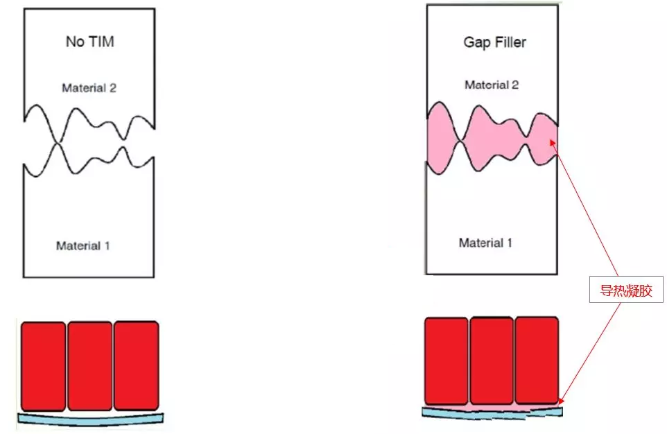 然而電池包組件采用的材料主要是金屬和塑料,電池組之間都是不規(guī)則的界面,部件表面公差也需要考慮,特別是在一個大的電池包中,公差一般在0.5mm-6.0mm,這樣就會導(dǎo)致部件接觸時存在空氣,而空氣的熱陰又極其的大,對電池包部件之間的熱傳導(dǎo)影響極大。
